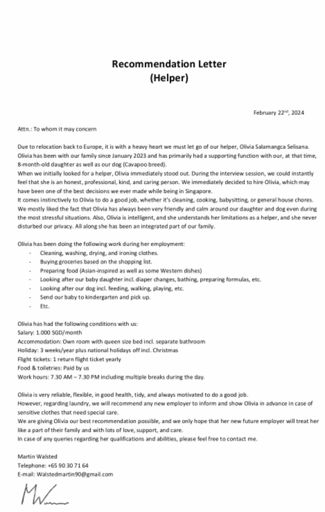 Hits: 762 Private InfoHelper InfoPersonal InfoEducation, Language, Training & TestimonialsWorking ExperienceSalary, Off-days and othersMaid Agency Info Private Info Information provided here is private to the maid only. Username (for log-in) Enter and remember a special name to log-in to edit/ update your details. Password (for log-in) Remember your password to log-in and update your record after sign-up This form is filled by? Maid (myself) Maid’s Current Employer Maid Agency (Singapore) Maid Agency (Overseas) Maid Agency (Maid Home Country) Maid’s Friend/ Family other Please indicate who is filling/ updating this form: How you know/ find us? Google Search Friend Facebook TikTok Instagram Maid Agency How do you know about our website? Google search, Friend referrer, Facebook, TikTok, Agency. I want find job with or without agency fee I want find job with or without agency fee 1) I want find job with No Agency Fee & No Salary Deduction 2) I am OK with Agency Fee of 1 to 2 months Salary Deduction Please tell us if you want job with no agency fee or ok to pay agency fee. SaveNext Helper Info I am now available for new employer: I am now available for new employer: Available Not Available My Selfie Photo img_20240522_185937.jpg delete Upload a photo of yourself - please provide half body photo without make-up. I am under agency? I am under agency? Under Agency Not Under Agency Maid Agency Name ZecruitX Not Applicable other Name as shown in Passport Mobile Phone Number Enter WhatsApp number with + country code Email please open new gmail account for free, if you don't have email address Date available to work Current Work Status Current Work Status Now working at Singapore employer waiting release for transfer At Singapore employer Urgent Transfer At Singapore maid agency Urgent Transfer At Home Country with Singapore experience At Home country First time helper At Home Country Maid Agency finding job At Singapore shelter or at embassy finding job other: Please tell us what you are doing now or going to be doing. Have obtained Release Letter for Transfer signed by my current employer? Have obtained Release Letter for Transfer signed by my current employer? Yes No Not applicable can ask your employer to give online consent to transfer via https://transfermaid.com/consent Photo of release letter from employer (if have) received_766300085602375.jpeg delete I am afraid of these animals & insects: I am afraid of these animals & insects: Dog (large) Dog (small) Cat Rabbit Bird Hamster Fish Cockcroach Lizard Snake Not afraid of any I can be contacted by: I can be contacted by: Whatsapp Wechat Viber Facebook Messenger I want to get job offers & new offers? do you want to receive news about new job offers and latest promotions and offers? I still have outstanding loan/ placement fee I still have outstanding loan/ placement fee Yes No SaveNext Personal Info Gender Gender Female Male Birthdate Input as dd/mm/yyyy. e.g. input: 01/12/2000 = December 1, 2000. Age 42 Height (cm) Weight (kg) Marital Status Single Married Separated Divorce Widowed I am from Indonesia Myanmar Philippines India Sri Lanka Cambodia other The country that is on my passport. I am now in Singapore Indonesia Philippines Myanmar India Cambodia Sri Lanka Hong Kong Dubai Kuwait Taiwan Malaysia other Tell us where you are now Number of Children How many children do I have? The ages of my Children are born Ages of my children? Number of sisters & brothers How many brothers and sisters do I have? What is my ranking in my family? What is my number ranking with my siblings (brothers and sisters)? FIN Number This is the number on the Singapore Work Permit Card of the Foreign Domestic Worker Passport Number Passport Expiry Date Enter date as in MM/DD/YYYY (month/date/year) Country of Birth Indonesia Myanmar Philippines India Sri Lanka Cambodia other Immigration Pass in Singapore Immigration Pass in Singapore Work Pass WP Work Pass SPass Work Pass EP Social Visit Pass Special pass Not in Singapore other: What pass am I now holding in Singapore Home Country Residential Address City State/ Province Country Postal Code Religion Religion Buddhist Christian Catholic Islam Sikh Hindu Others other: Ethnic Group Ethnic Group Indonesian Malay Filipino Burmese Chinese Indian other: Photo of your Passport Photo of your work permit card (Front) Photo of your work permit card (Back) Facebook Messenger ID Enter Facebook Messenger, Wechat ID I CANNOT eat the following: I CANNOT eat the following: Pork Beef Chicken Vegetables Nuts Fish Clams other: Interests or Hobbies Interests or Hobbies Sports Photography Art/Crafts Outdoors Yoga Music Cuisine other: SaveNext Education, Language, Training & Testimonials Highest Education Level Highest Education Level No formal education Primary/Elementary (6 years) Secondary (Junior High 10 years) Post Secondary (Senior High School/Diploma 12 years) University other: Languages I can speak well: Languages I can speak well: English Chinese(Mandarin) Hokkien Teochew Cantonese Korean Malay Tamil Hindi Bengali Telugu other: What can you speak? This is for video or phone interview. If you are learning English, please choose other: and key in learning English. I have the following certificates: I have the following certificates: Caregiver First-aid Nursing Bedridden care Stroke care Dementia care Elder care Baking None other: Testimonials from previous employers Education & Training certificates (caregivers, baking, SIP, English etc.) SaveNext Working Experience Countries I have worked as Domestic Helper Countries I have worked as Domestic Helper Singapore Indonesia Philippines Myanmar Cambodia India Sri Lanka Malaysia Hong Kong Taiwan Dubai Saudi Arabia Kuwait other: What countries you have worked before as Maid? Number of years working as helpers in Singapore Enter total number of years working in Singapore as maid. Number of Singapore employers worked for? Total number of Singapore employers I have worked for? Number of Si